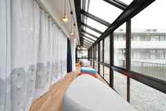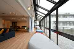 小田急線本厚木駅近くの市街地にある女性専用シェア住居です。駅前のメイン通りより1ブロック内側の、市民が集う公園に接した場所にあり、ショッピングや食事に便利な立地です。エントランス、ダイニング、リビングは天井が高く、たっぷりの収納スペースがあります。リビングにはチークのテラス材を敷き詰めた広くて気持ちの良いバルコニーが付いています。
