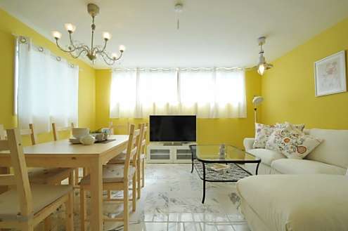 ダイニング側にまわると、広々とした空間がさらに実感できます。ソファの対面に設置された共用のTVは大型のものですが、ほら、小さく見えます。
