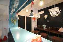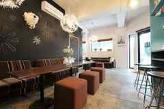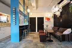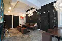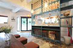 日中は陽が差し込み明るく気持ちいいラウンジスペース。日が落ちると、恵比寿の雰囲気にマッチしたムードのある空間に。オトナなひとときはいかが?