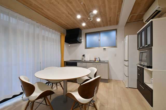 入り口を挟んで、ソファスペースの反対側がダイニングとキッチンです。